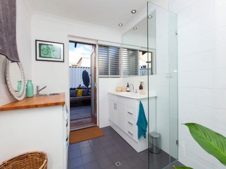 The bathroom and laundry were cleverly renovated using neutral colours and quality finishes to create a beautiful, functional space. A grey and white colour scheme was chosen for the bathroom/ laundry renovation, with frameless shower screen installed and a mahogany bench top for the laundry sink. The result is gorgeous!