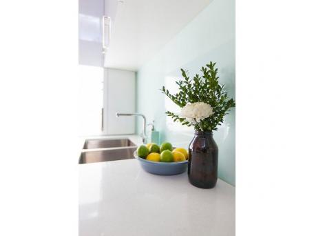 The kitchen needed a complete re-structure and makeover. The owners changed the layout of the kitchen, opening up the space and creating an eat-in kitchen with breakfast bar. They did most of the renovations themselves, but left the kitchen to an expert. Choosing a Caesar Stone bench and glass splashback, along with white cabinetry the new kitchen is modern and fresh.