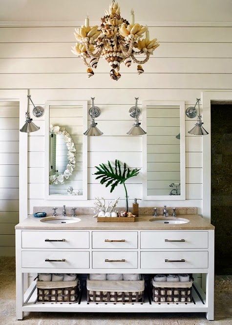 This island inspired bathroom is soothing and inviting with a tropical feel. The shell chandelier may not be to everyone’s taste, but it works perfectly with the all white room, storage baskets and touch of greenery. A beautiful bathing space.