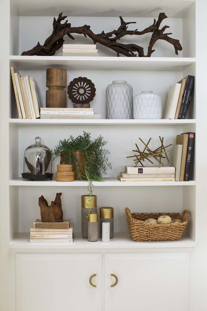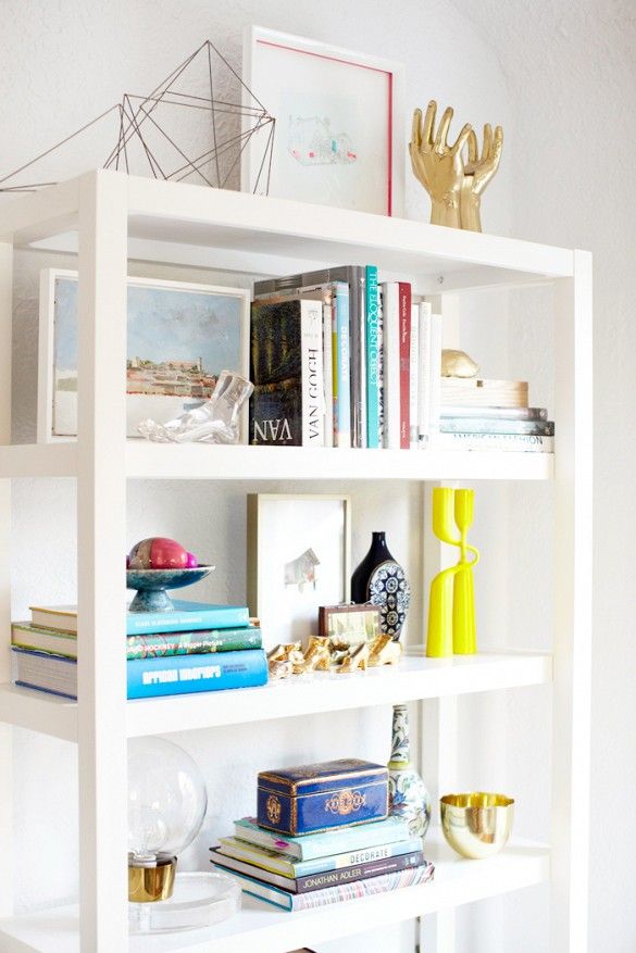 – Symmetry is a good way to start when placing objects on the shelves. It helps give a bit of direction to where each item or book is placed. For example it always looks great to have books or magazines stacked both vertically and horizontally, but if you are going to have a horizontal stack of magazines on one shelf, its a good idea to repeat that elsewhere to balance out the styling. Even having the same object, like a glass vase dotted throughout the display helps create symmetry and balance.