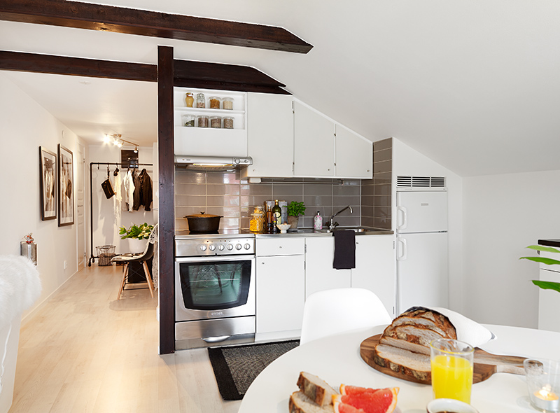 This tiny studio apartment has managed to include a full kitchen by building into a wall space. The kitchen is design to fit perfectly in this space, even the cupboards are shaped just so! Keeping the colours light helps the area look bigger in the apartment, while also giving it a contemporary look. The clothes rack in the entry way looks lovely and is also a practical place for storage. Sometimes artwork can be forgotten in a small space, when walls are considered too small, but artwork is the perfect way to add style and personality to a small space. Take the time to choose the right size artwork and something that will compliment the space, not overwhelm it, the artwork in the hallway here is just enough.