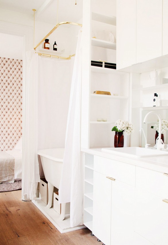 Clever design has given this studio apartment great storage space. Building a platform for the bed has created a perfect spot for storage underneath, these large pull out drawers are such a great use of space! The curtain to separate the sleeping and living areas looks great and is also perfect for privacy or those days when you just want to hide an un-made bed! Th white walls are also a good choice in this small space.