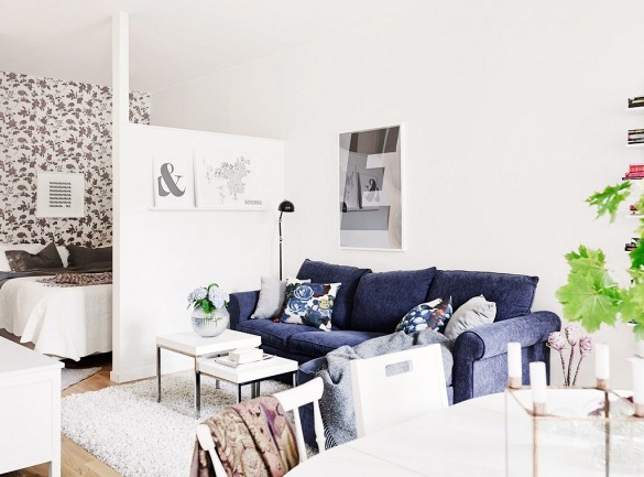 This apartment has used clever little ideas to make the small space practical and useable. The choice of a half wall to break up the living and sleeping areas is a perfect way to still allow the light and air through, while also not making the rom feel half the size. The area rug in the living room is great choice because it is a light, neutral colour , a good choice for a small space, while also giving the living room its own area. The smaller pair of coffee tables is great for a small apartment, as they don’t take up too much space and can be used for other purposes like bedside tables. The choice of artworks are not too large for the space and compliment rather than overwhelm the small room.