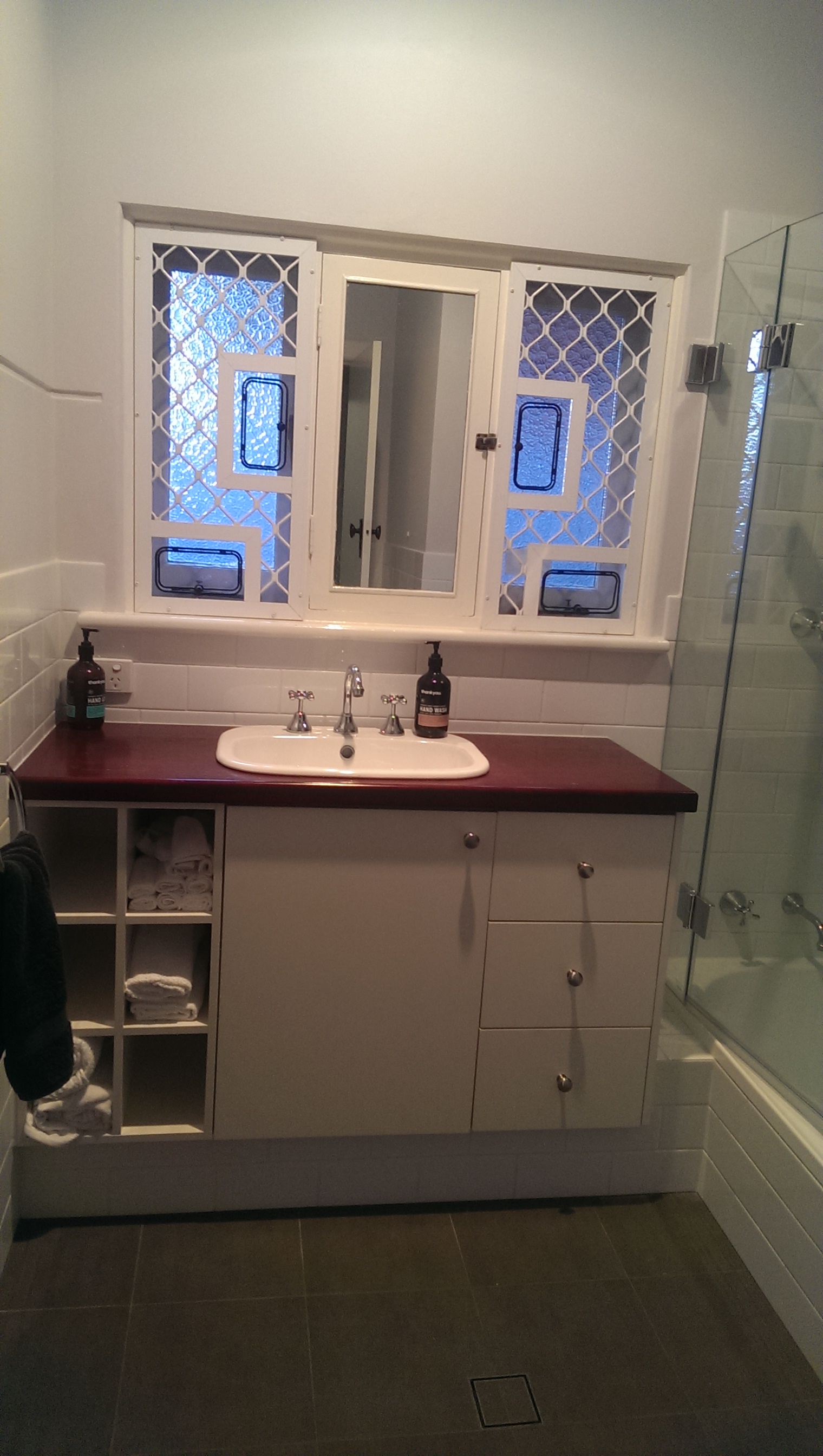 Classic basin and tap ware was chosen along with a vanity which has great storage. The classic finish on the bathroom renovation works perfectly in this older style home. The owners have been clever in keeping colours neutral and choosing good quality fittings.