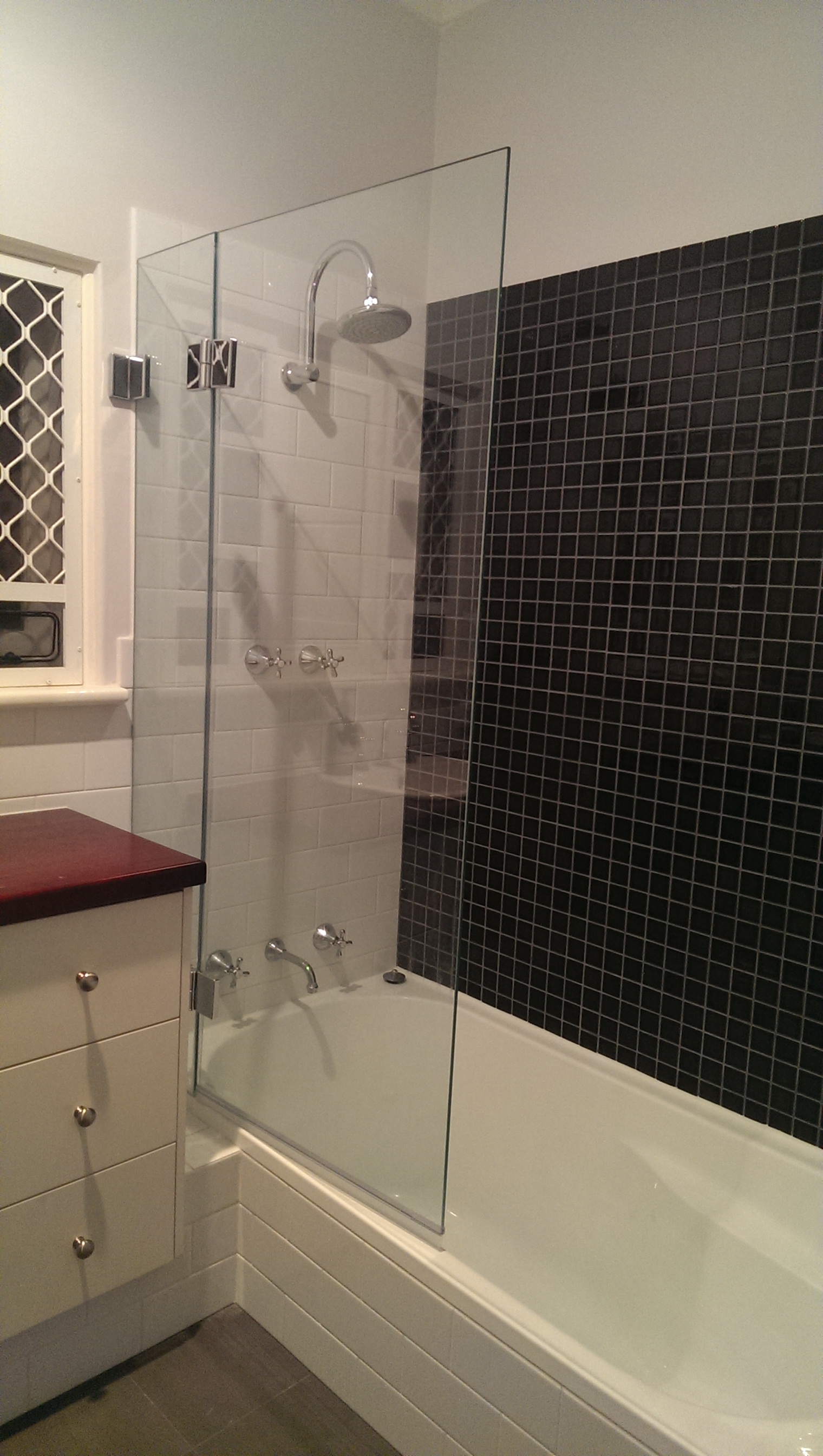 To update this tired old bathroom the owners chose a classic look. Large charcoal floor tiles were complimented by white subway tiles on the walls and a feature wall behind the shower of small charcoal tiles. The pedestal basin was replaced with a new vanity featuring a beautiful solid jarrah wood bench top.