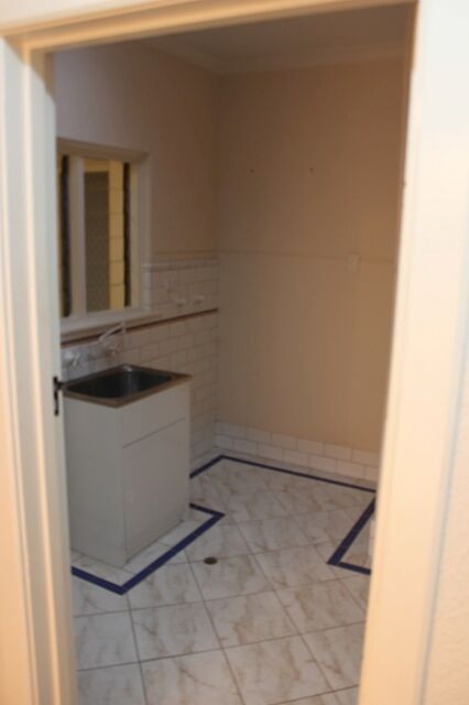 The laundry had about the same amount of appeal as the old bathroom. It looked outdated and tired. The same tiles were in the laundry with the same blue trim. It had an old laundry tub and the white enamel tap ware and odd trim tile as in the bathroom.