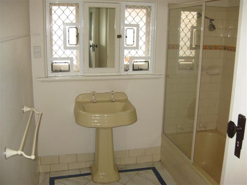 The main bathroom was still in the original condition when the owners bought the house. This meant white floor tiles that had a grey swirl through them, with a border of dark blue tiles around the floor. The shower had white enamel tapes and a completely different feature tile, and the pedestal basin was in bad shape. The walls were in desperate need of a coat of paint.
