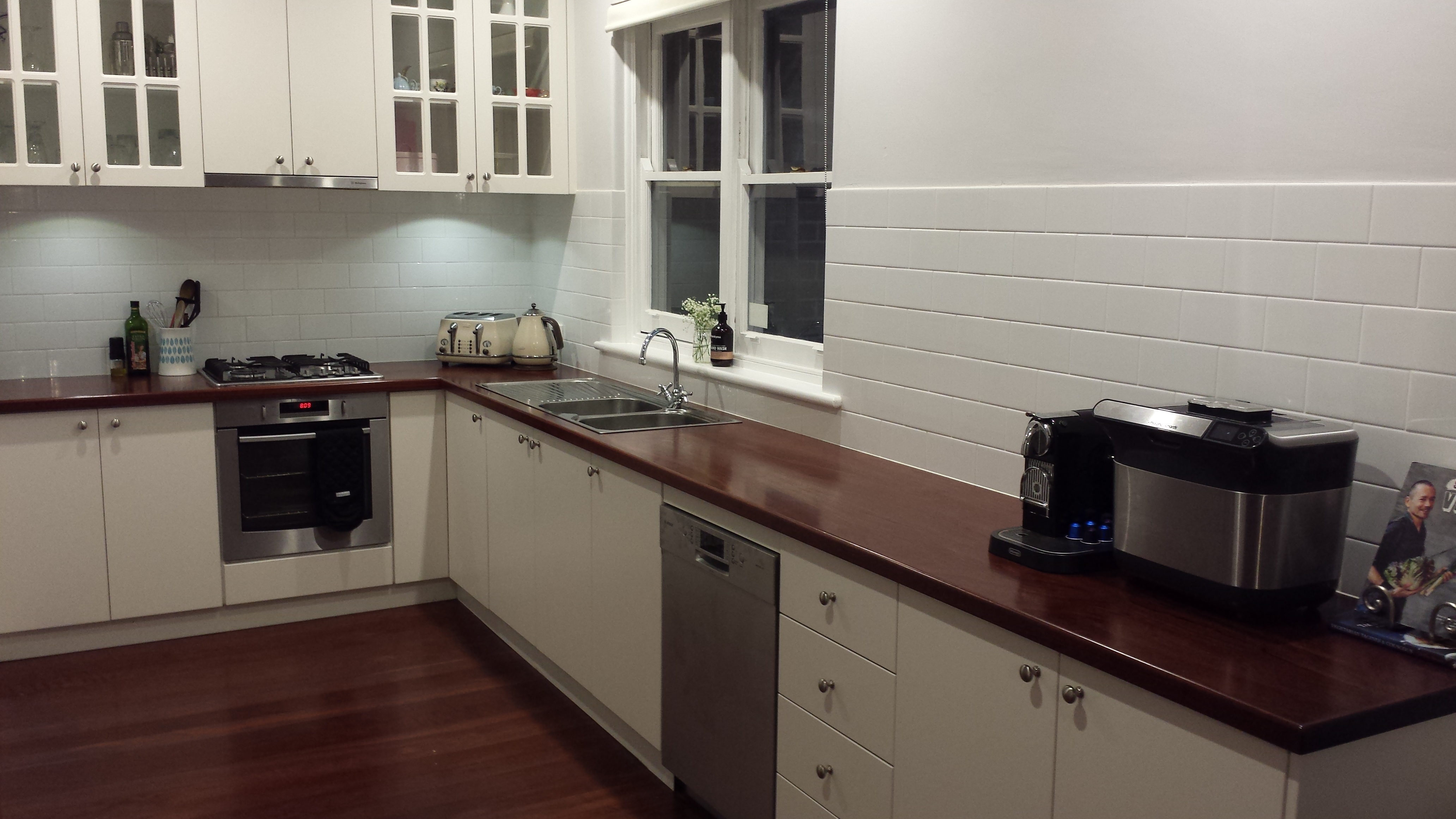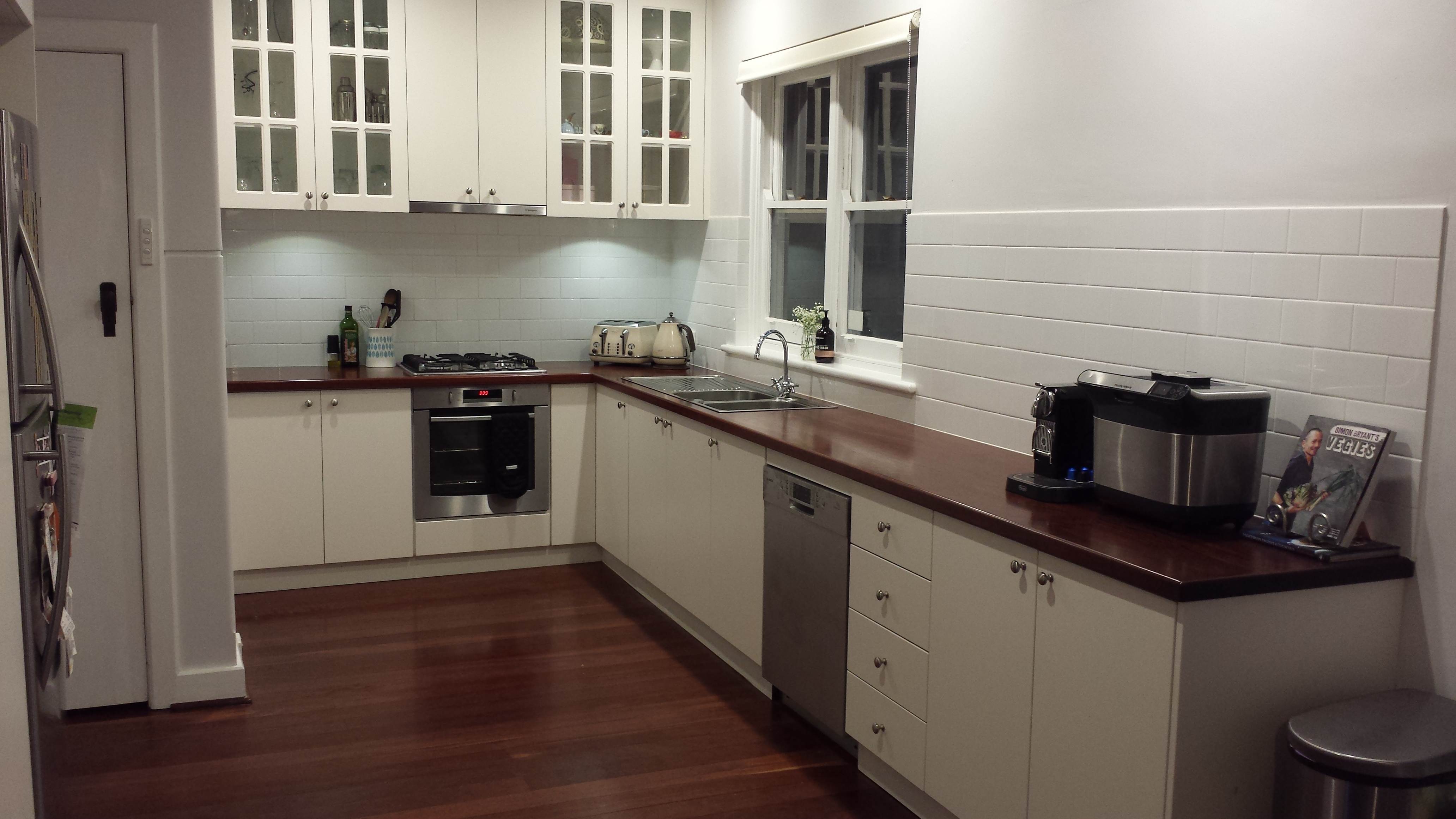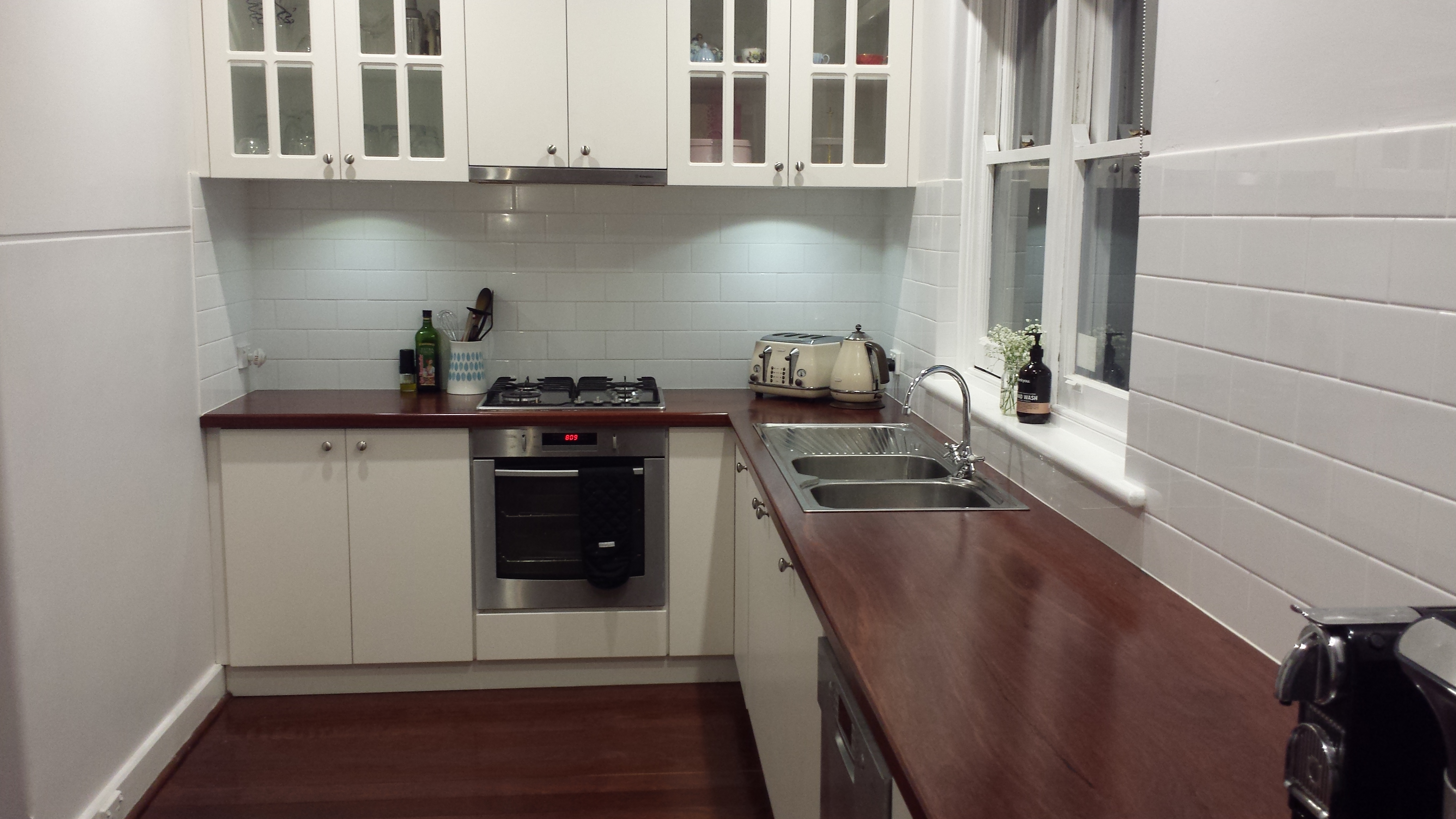 As you can see in the picture above the by taking out the old door and creating a longer bench it has also allowed for an extra cupboard and drawer space. Choosing the glass doors for the top cupboards is clever and adds interest to the classic style kitchen, while also making the kitchen feel a little more open. In a small space bulky overhead cupboards can make the space feel even smaller, so the glass front cupboards prevent this. The owners chose an traditional style tap, which works perfectly here and kept the appliances stainless steel.
