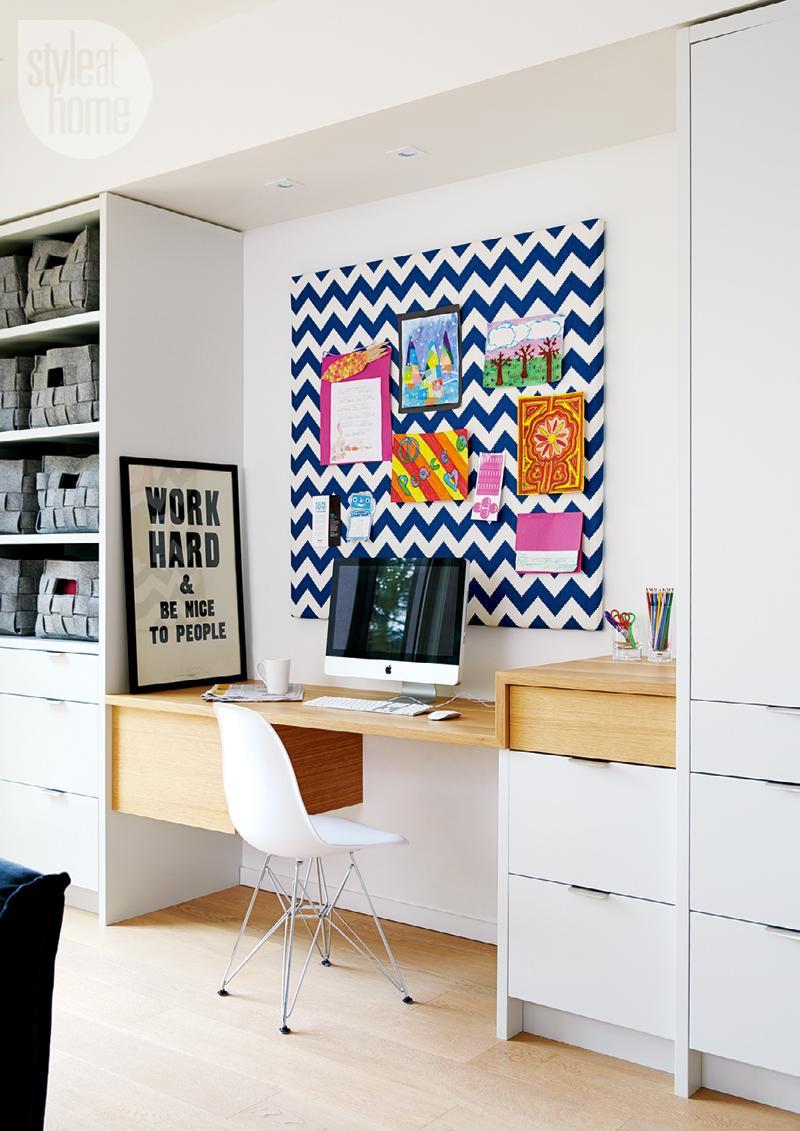- Think of fun ways to make the most of the space. Things like chalkboard paint behind the desk, a magnetised surface to hang pictures and kids artworks or a pin board to display family photos will make the space more inviting!